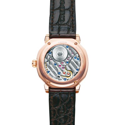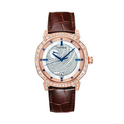 ダイヤルは「湖氷」をテーマに、ゆらめく水が徐々に凍る様を表現。有機的な曲線に沿ってセッティングされているダイヤが、18Kホワイトゴールド製のダイヤル上で美しい輝きを放ちます。また、4箇所のインデックスとしてブルーサファイア、10時位置のパワーリザーブ部とダイヤル外周部のサークルには白蝶貝を用いて、ダイヤモンドの輝きの中で柔らかな白蝶貝が美しく映えるデザインに仕上げています。