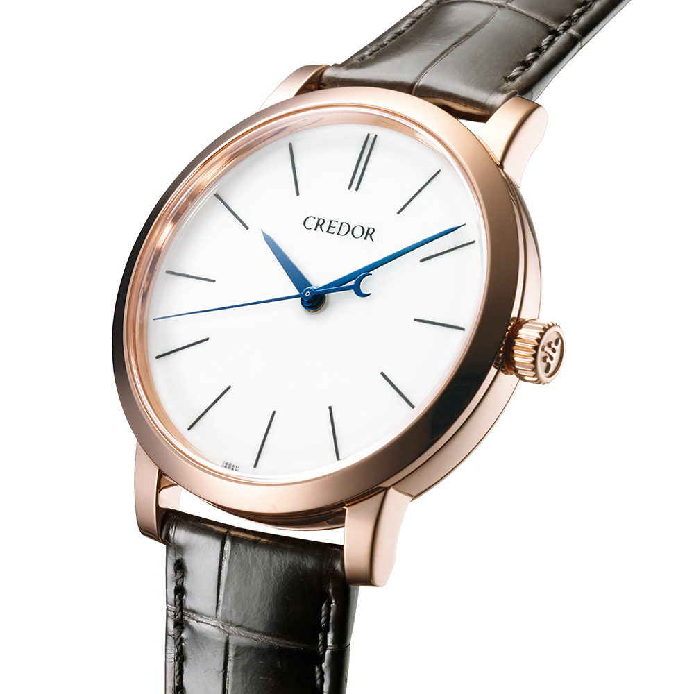 信州に降り積もる雪をイメージした白い磁器ダイヤルに、職人が手書きでインデックスとブランドロゴを施しています。新たに調色した透明感と深みのある黒色が、18Kピンクゴールドケースやテンパーブルーの針と調和し、新たな美しさを湛えています。