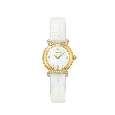リネアルクスの18Kイエローゴールドケースに2列のパール、ダイヤ付き18Kイエローゴールドパーツを組み合わせたデザインです。ダイヤルにも白蝶貝をあしらい、パールの柔らかな美しさがエレガントな曲線のケースと相まって、優美な魅力を放つモデルとなっています。